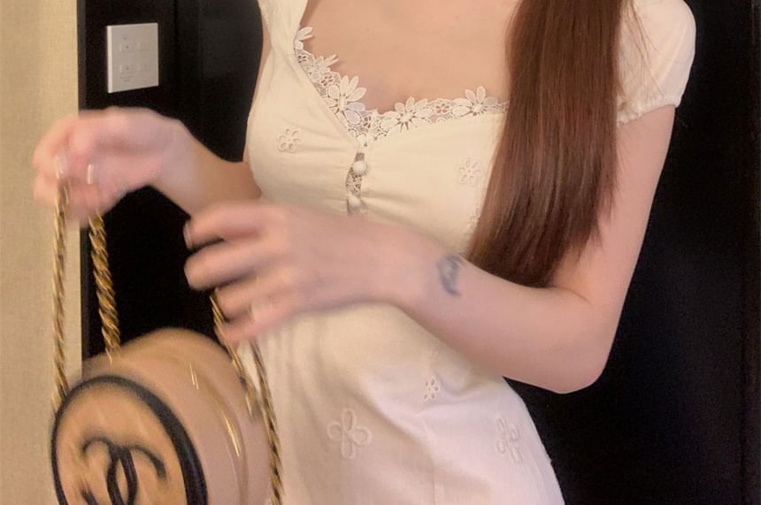 Short-Sleeve A-Line Dress Mini Floral Trim Square-Neck
