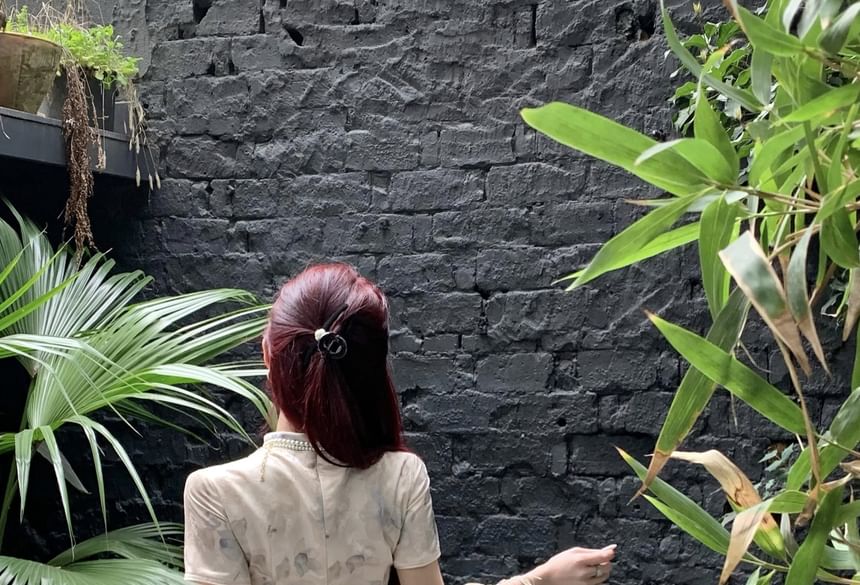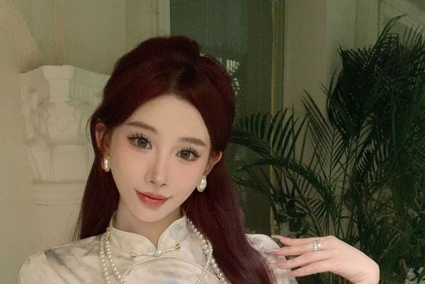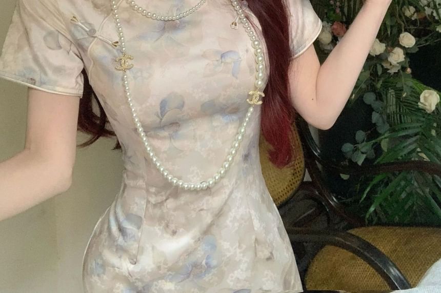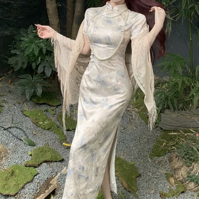 Short-Sleeve Floral Side-Slit Maxi Qipao