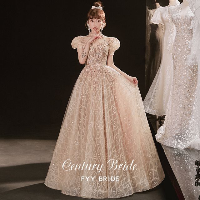 Short-Sleeve High Neck Floral Embroidered A-Line Evening Gown