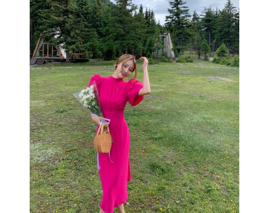 Short-Sleeve Open Back Plain Midi A-Line Dress