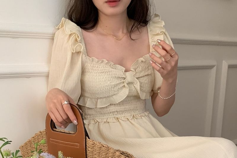 Short-Sleeve Plain Ruffle Midi A-Line Dress