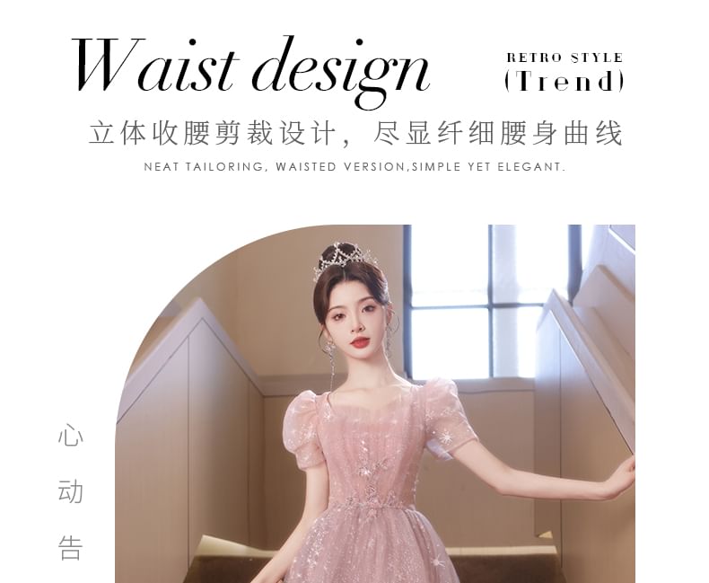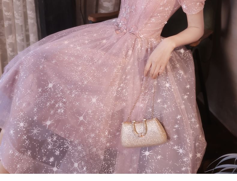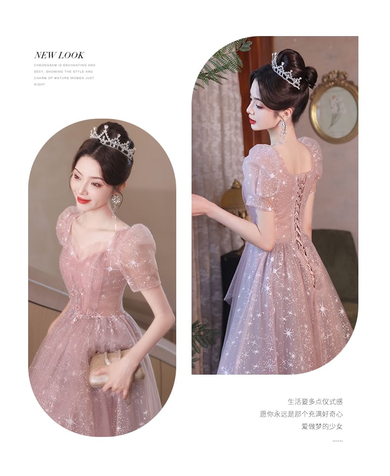 Short-Sleeve Sequin Mesh Midi A-Line Cocktail Dress
