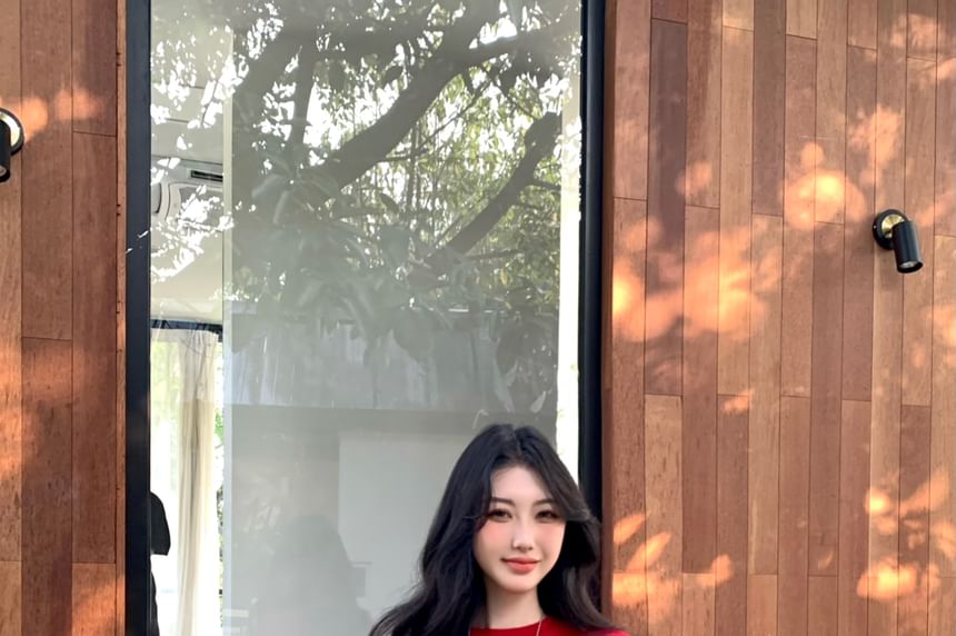 Shorts / Buckled Crew Rhinestone Plain Rise Short-Sleeve Low Neck Crop Tee