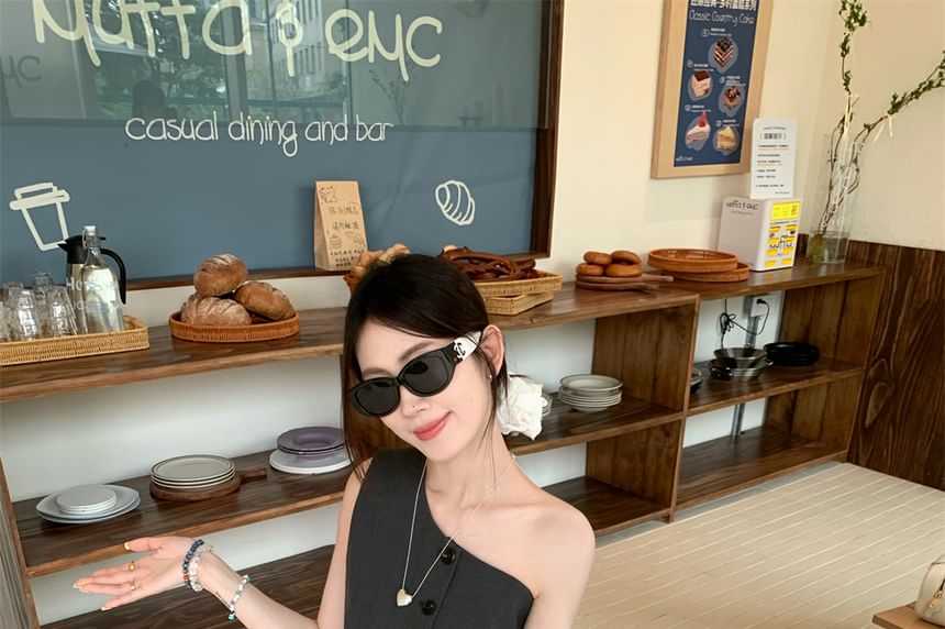 Sleeveless One Shoulder Plain Button Top / Drawstring Waist Plain Mini A-Line Balloon Skirt
