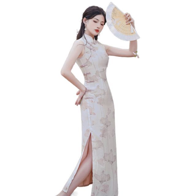 Sleeveless Floral Midi Qipao / Long Cardigan / Set