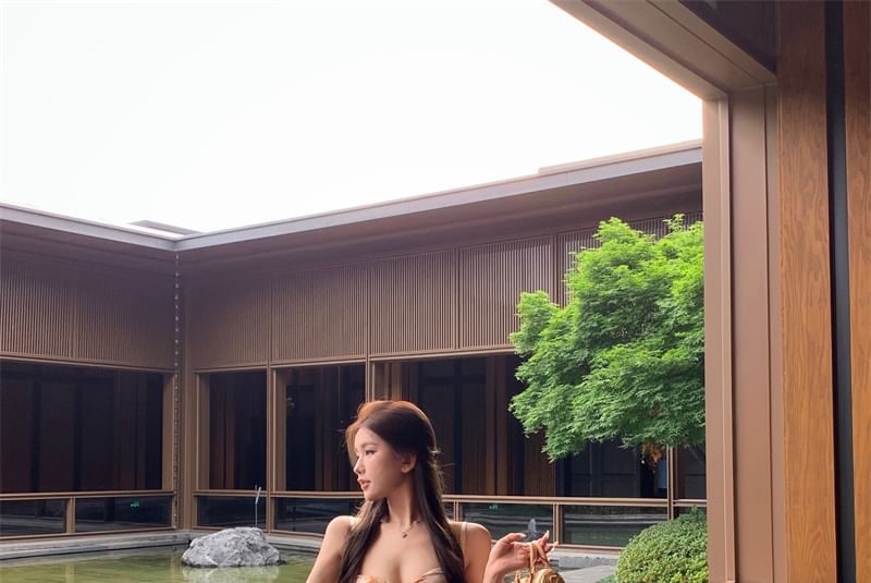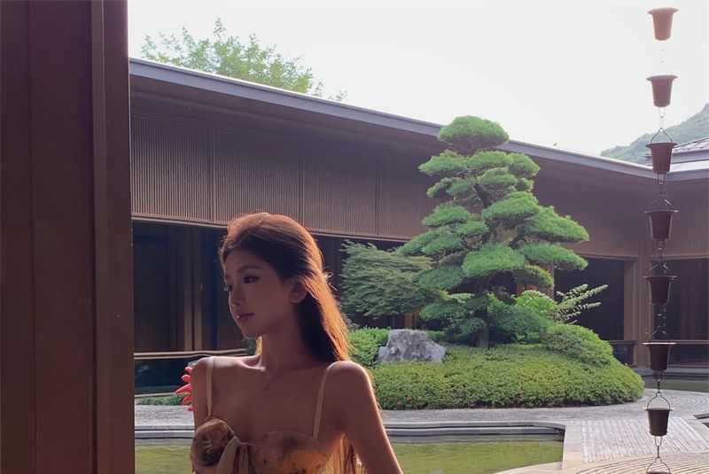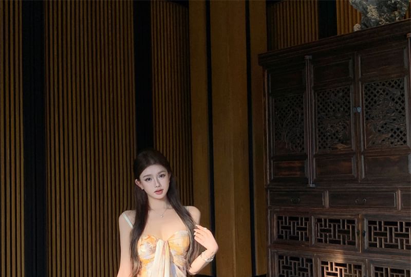 Spaghetti Strap Floral Print Ruched Bodycon Maxi Dress