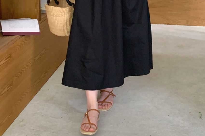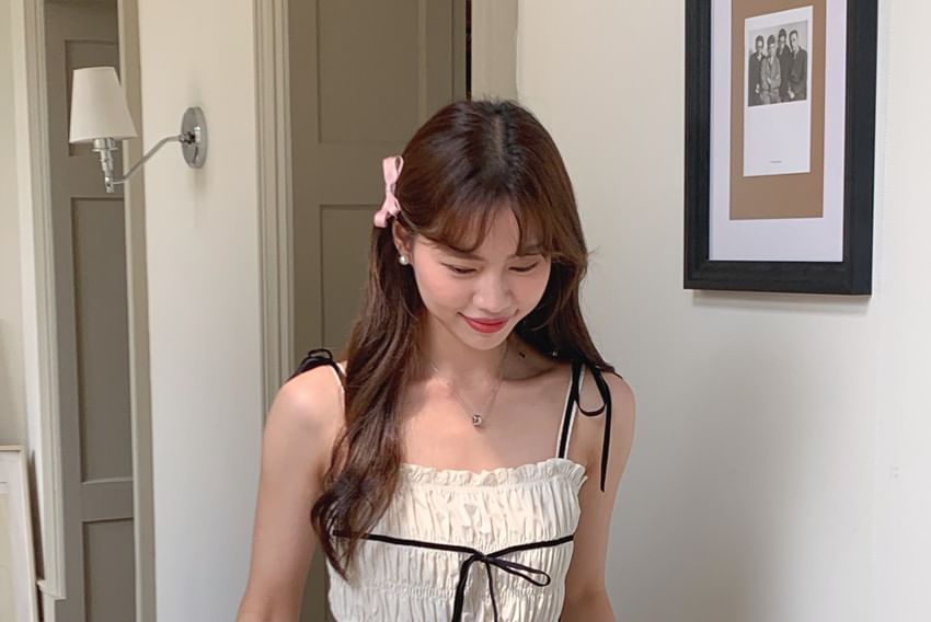 Spaghetti Strap Ribbon Accent Plain Midi A-Line Dress
