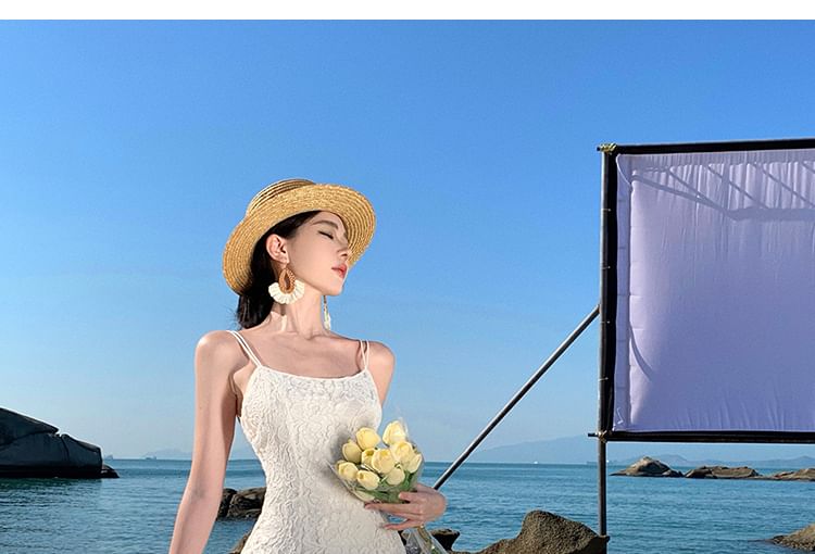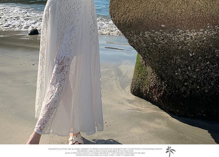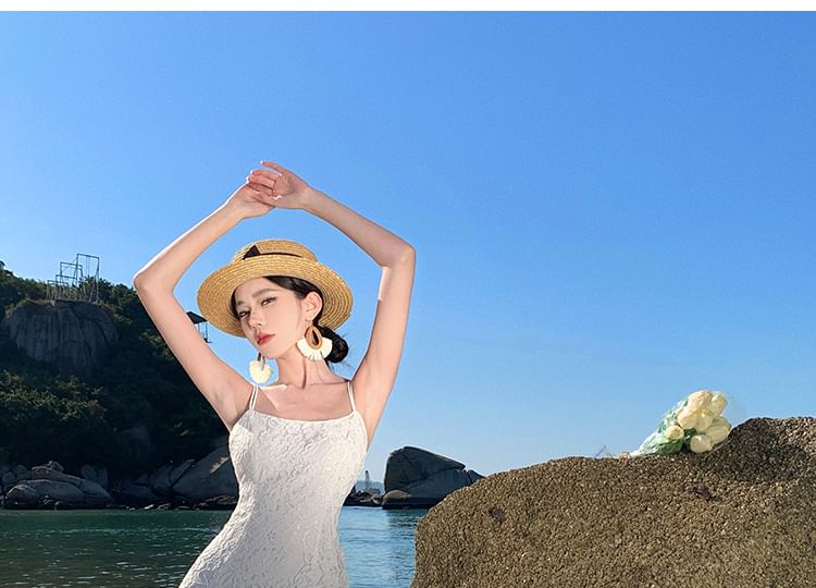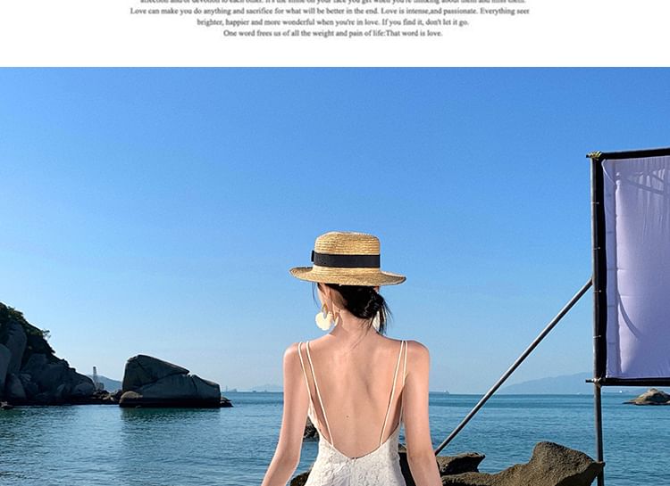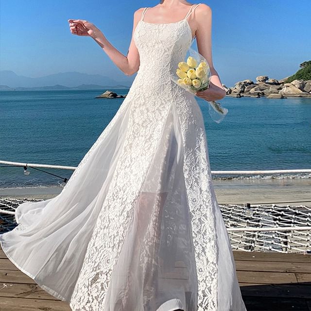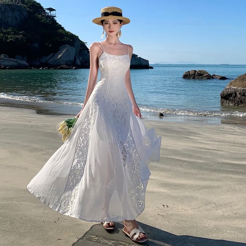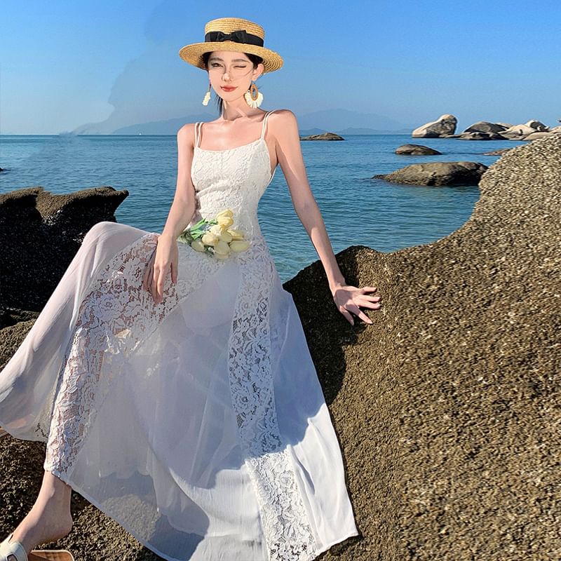 Spaghetti Strap Scoop Neck Plain Lace Panel Open Back Maxi A-Line Dress
