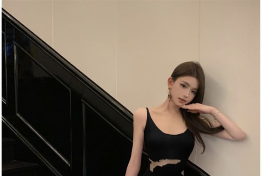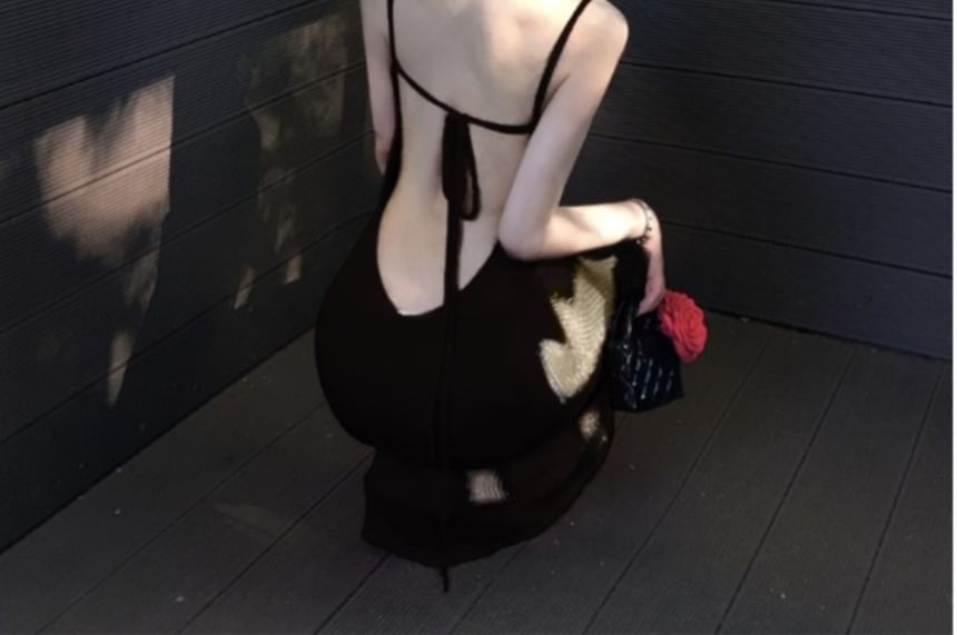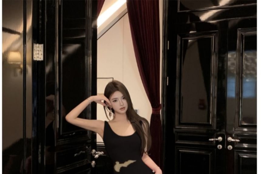 Spaghetti Strap Scoop Neck Print Backless Bodycon Midi Dress