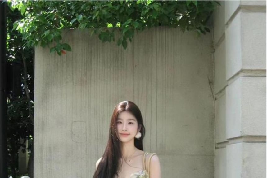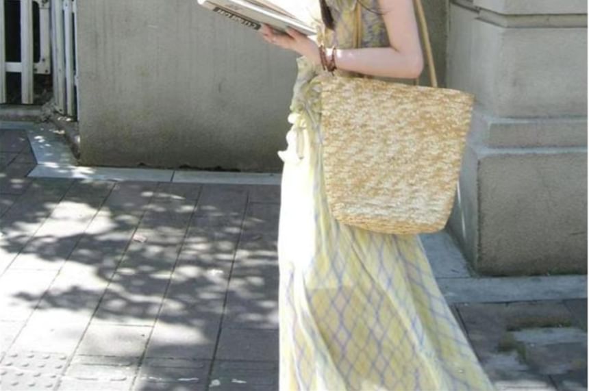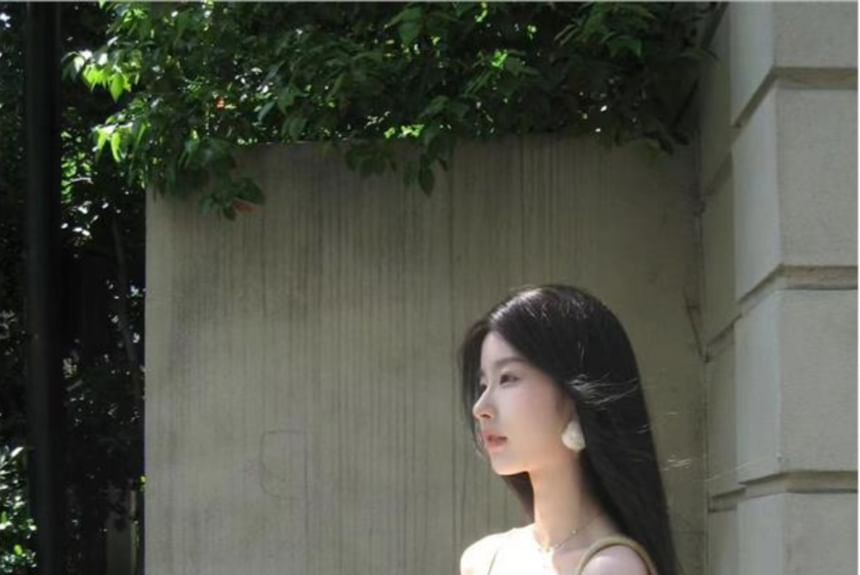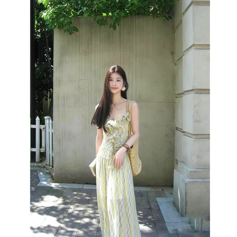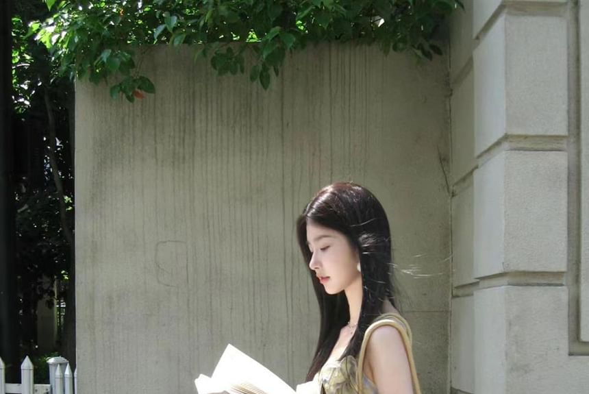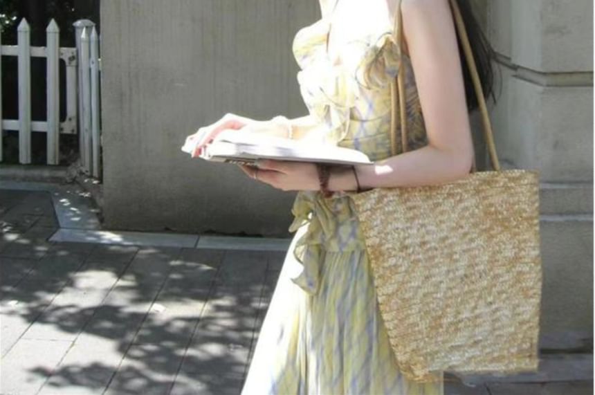 Spaghetti Strap V-Neck Patterned Ruffle Trim Midi A-Line Dress