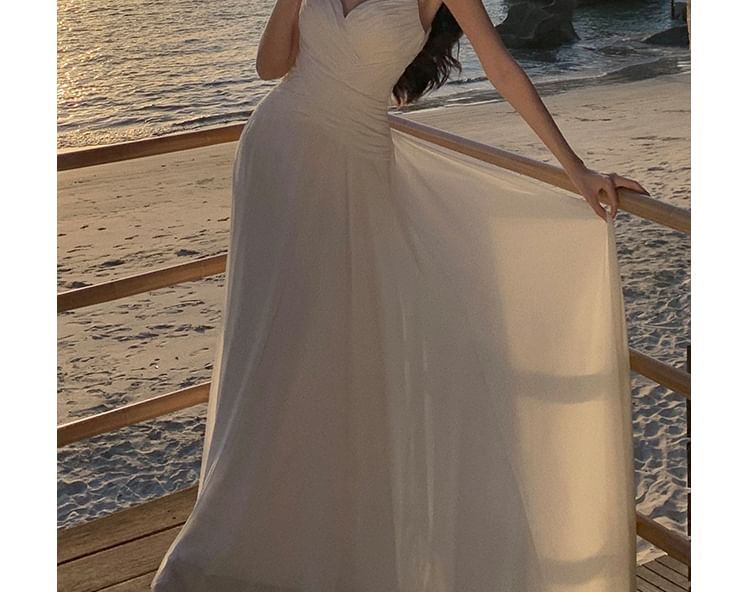 Spaghetti Strap V-Neck Plain Ruched Trained Open Back Maxi A-Line Dress