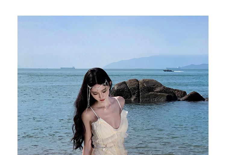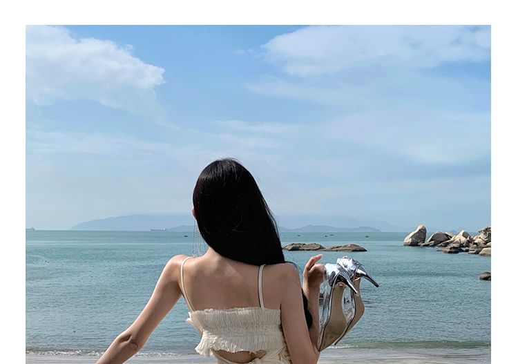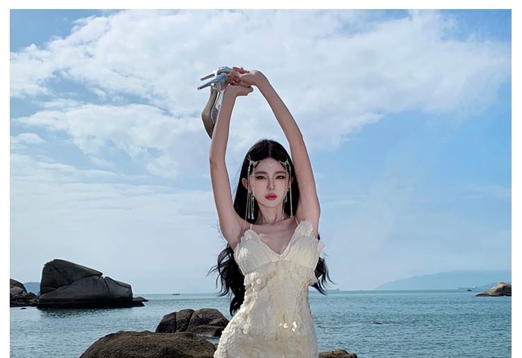 Spaghetti Strap V-Neck Plain Sequin Ruffle Maxi Sheath Dress