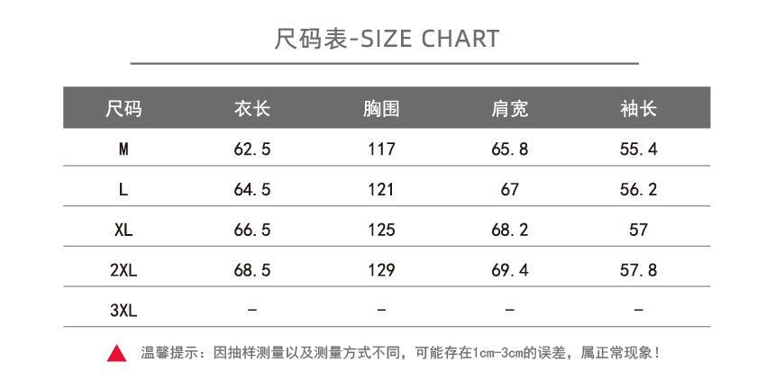 | Total Length | Chest | Shoulder Width | Sleeve Length |