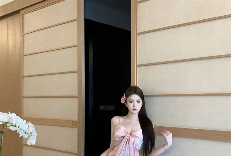 Strap V-Neck Dress A-Line Print Floral Maxi Spaghetti Ruched