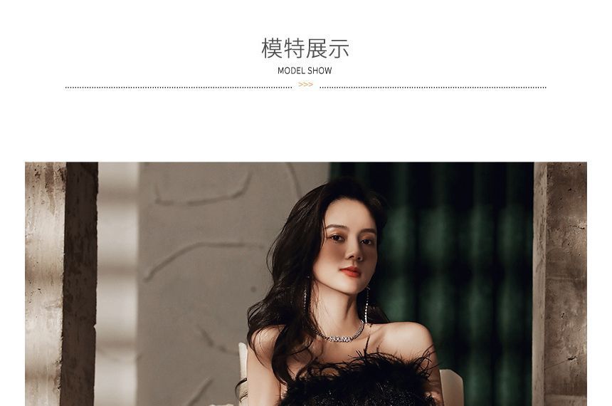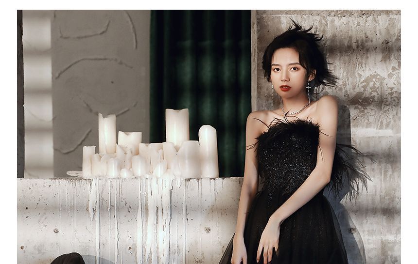 Strapless Fluffy Trim Sequined A-Line Evening Gown
