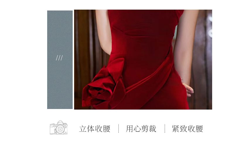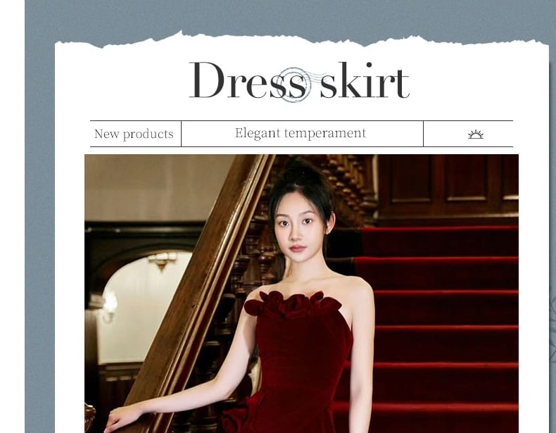 Strapless Plain Floral Accent Trained Velvet Mermaid Evening Gown