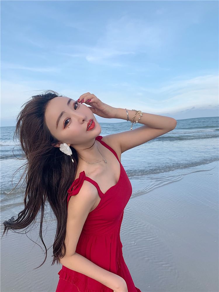 Tie Shoulder Plain Ruffle Midi A-Line Dress