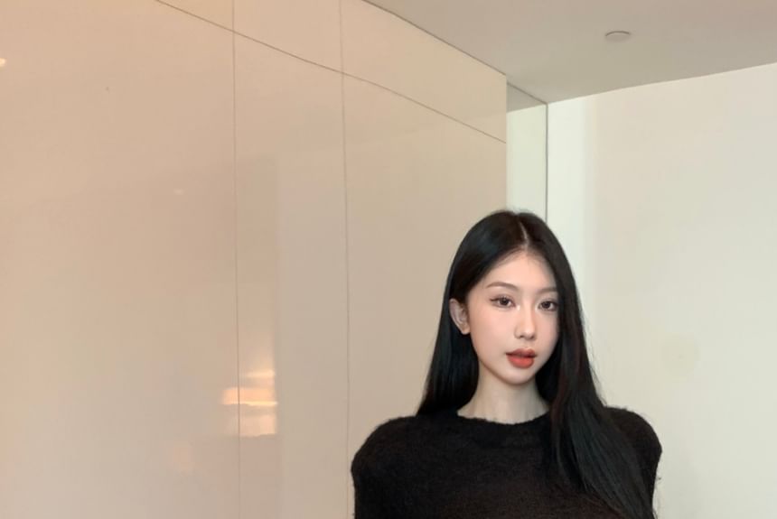 Long-Sleeve Round Neck Plain Crop Top / High Rise Plain Faux Leather Wide Leg Pants