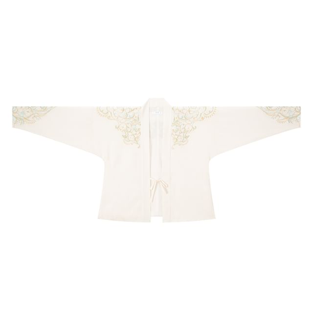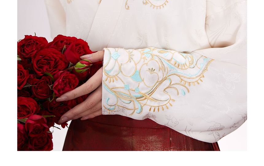 Traditional Chinese Long-Sleeve Top / Print Maxi A-Line Pleated Skirt / Necklace / Set