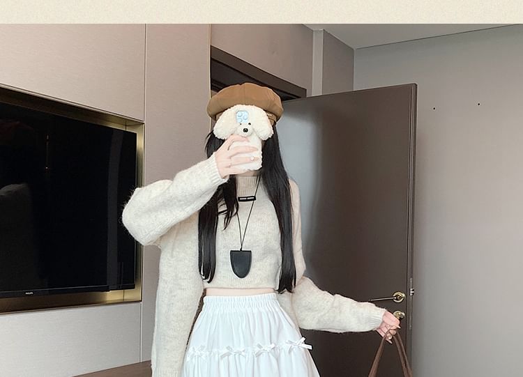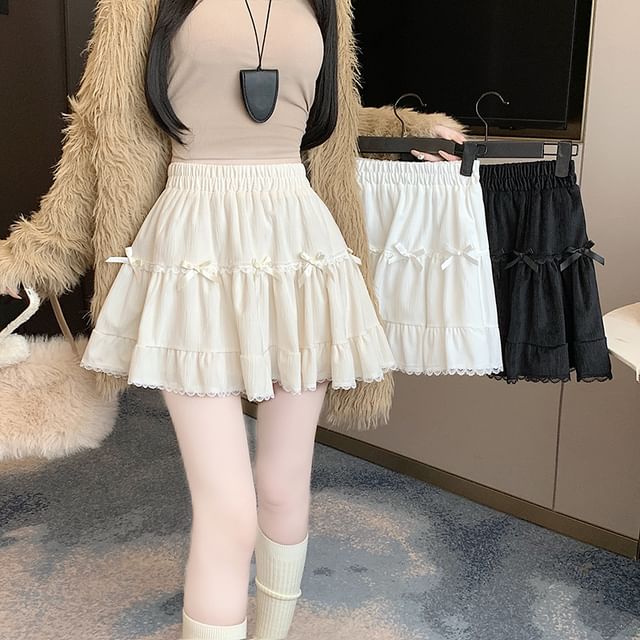 High Waist Plain Bow Accent Lace Trim Velvet Mini A-Line Skirt