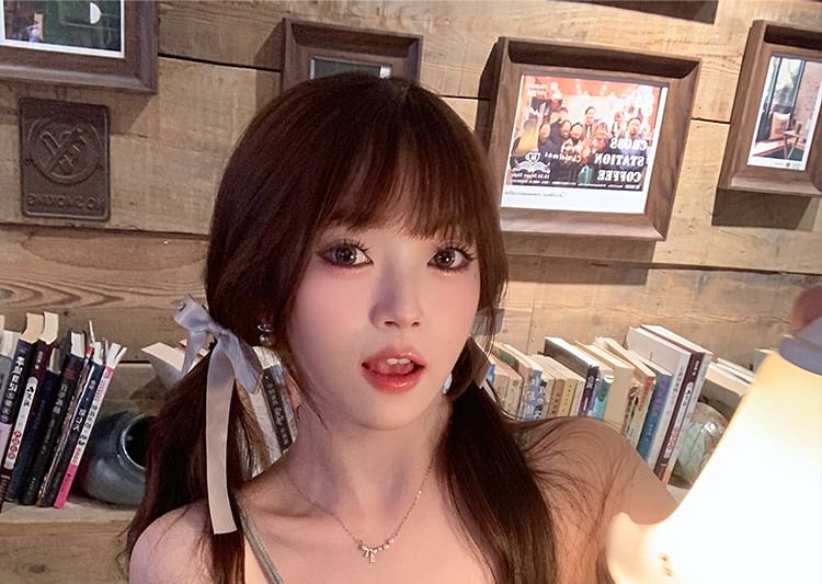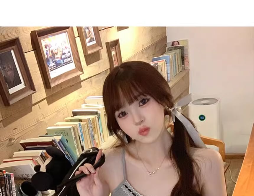 Trim Plain Crop Top Lace Accent Bow V-Neck Cami