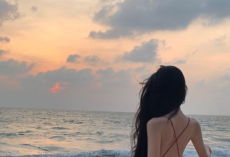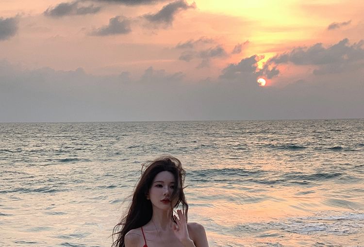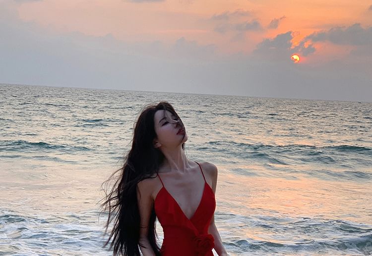Trim Ruffle Strap Open Dress A-Line Plain Spaghetti Back V-Neck Plunge Maxi Slit