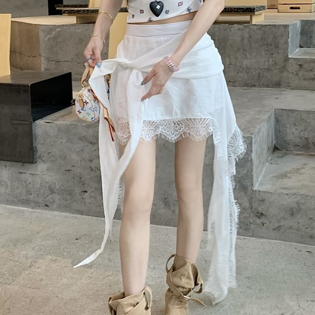 High Waist Plain Lace Trim Asymmetrical Wrap Skort