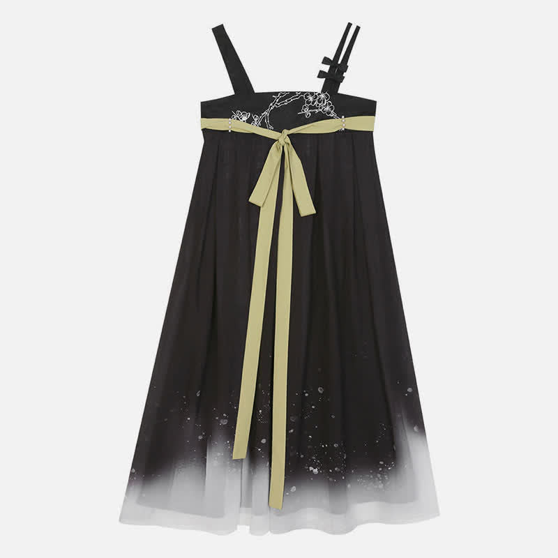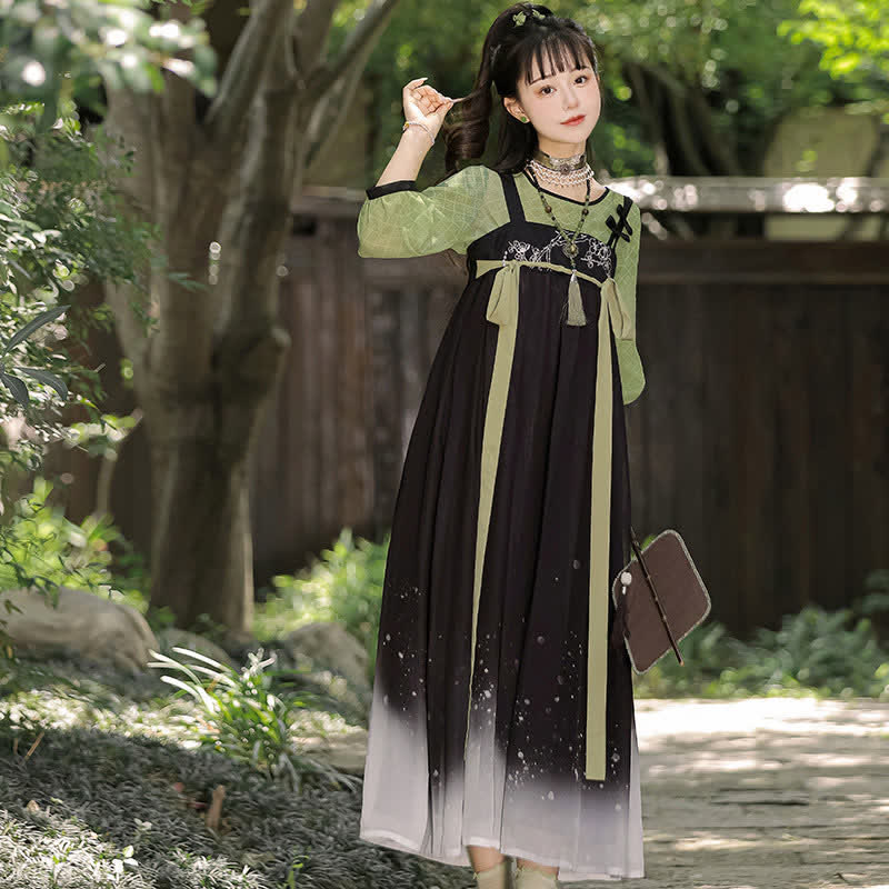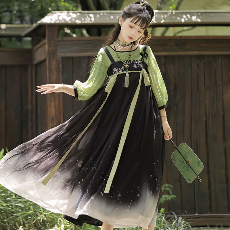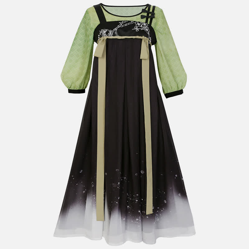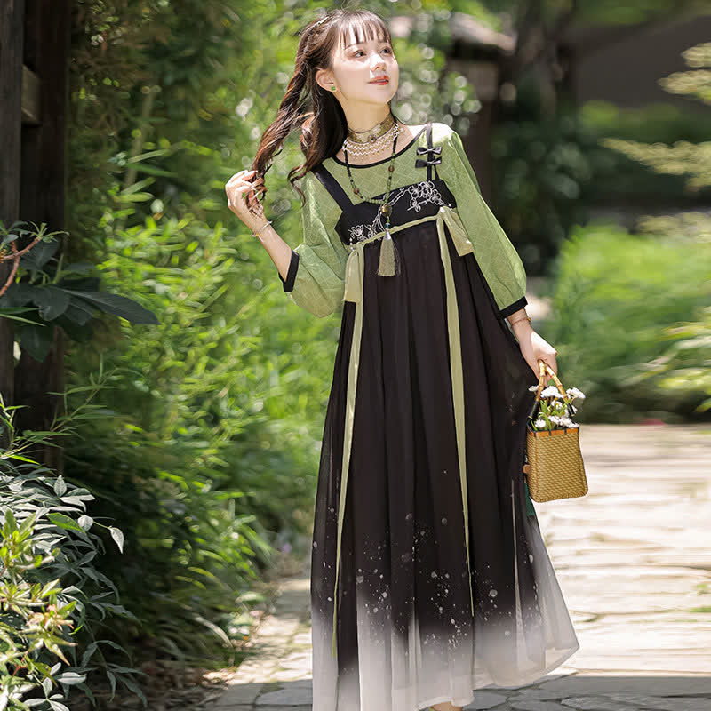 Vintage Green Black Blossom Snow Print Slip Dress Shirt