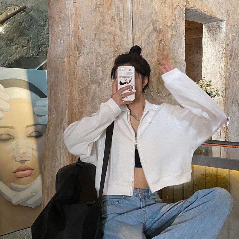 Collared Plain Applique Waffle Zip-Up Crop Jacket