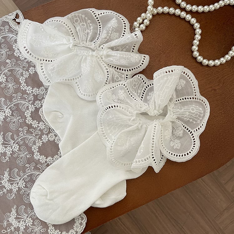 Black/White Calf Socks with White Floral Pattern Lace Trim